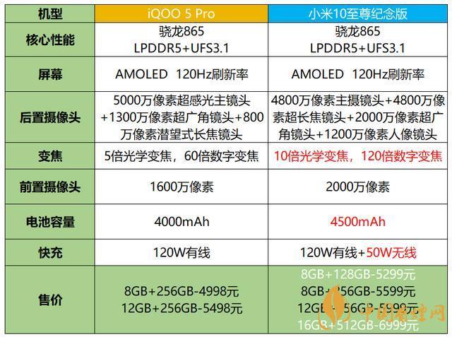 小米10至尊紀(jì)念版的8GB+256GB售價5599元,12GB+256GB售價5999元,iQOO5 Pro分別為4998元和5498元,兩個版本的差價分別是500元、600元。