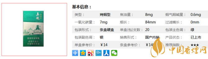 | 煙長(zhǎng):84mm | 過(guò)濾嘴長(zhǎng):25mm | 包裝形式:條盒硬盒 | 單盒(包)支數(shù):20 |