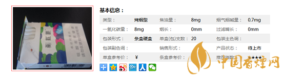 | 類型 :烤煙型 | 焦油量 :8mg | 煙氣煙堿量 :0.7mg | 一氧化碳量 :8mg |