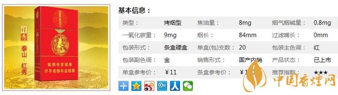 泰山(祥秀)是泰山“秀”字輩中價格最實惠的一款,這煙的包裝整體以紅色為主色調(diào),色彩紅火喜慶。雖然口感不是很醇,但煙氣不嗆較柔順。口味偏干,偏淡,在8焦的煙里算不錯的,適合做口糧。下面就由香煙網(wǎng)小編帶大家一起來了解泰山祥秀的相關(guān)信息。