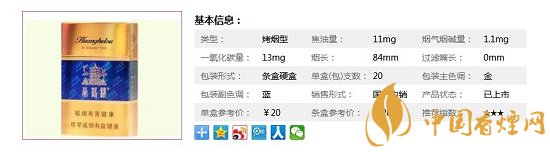 | 類型 :烤煙型 | 焦油量 :11mg | 煙氣煙堿量 :1.1mg | 一氧化碳量 :13mg |