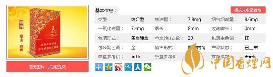 泰山錦秀使用優(yōu)質(zhì)的津巴布韋、美國、巴西等進口煙葉,配以國內(nèi)醇化兩年以上的云、貴、川上等煙葉,采用獨特自然醇化與低溫處理工藝,經(jīng)過上百次反復(fù)配伍實驗精做而成。下面一起來看下泰山錦秀的具體參數(shù):一盒20支,煙長84mm,焦油量8mg,煙堿量0.8mg,一氧化碳量9mg。