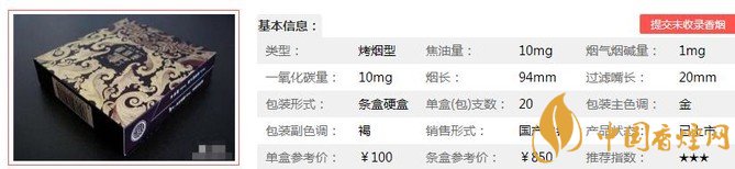 | 類(lèi)型 :烤煙型 | 焦油量 :10mg | 煙氣煙堿量 :1mg | 一氧化碳量 :10mg |