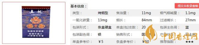 | 類型 :烤煙型 | 焦油量 :11mg | 煙氣煙堿量 :1.1mg | 一氧化碳量 :13mg |