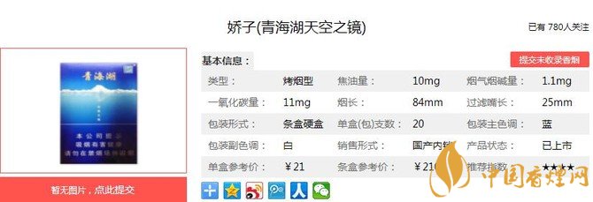 嬌子青海湖天空之鏡的包裝十分精致美觀,是一款令很多煙民因顏值而心動行動的香煙,但這款香煙地域性太強,以至于很多煙民都沒有見過。經香煙網小編市場調查嬌子青海湖天空之鏡售價為21元/包。