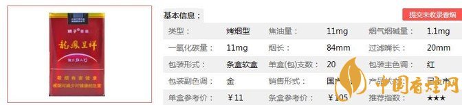 | 類型 :烤煙型 | 焦油量 :11mg | 煙氣煙堿量 :1.1mg | 一氧化碳量 :11mg |