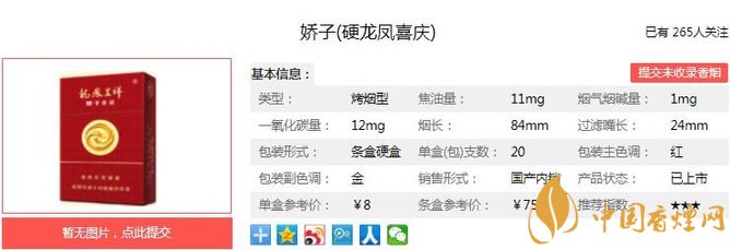 煙支長84mm,過濾嘴長24mm,龍鳳呈祥精品生產(chǎn)線,28個環(huán)節(jié)精密檢測品質(zhì)保障,彰顯自然時尚清新的魅力。下面我們一起來看嬌子硬龍鳳喜慶的參數(shù)信息:焦油量:11mg 煙堿量:1.0mg 一氧化碳量:12mg