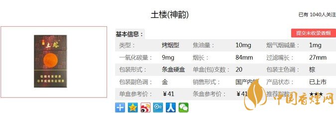 土樓神韻煙支長84mm,過濾嘴長27mm,白色豎紋卷煙紙,煙絲端切口平整,煙絲金黃油潤;咖啡色水松紙,劃分為若干小格,其中是陰陽文交替出現(xiàn)的“客”“家”“土”“樓”字樣,前端一道金圈之上印有品名“土樓”。下面我們一起來看土樓神韻的參數(shù)信息:焦油量:10mg 煙堿量:1.0mg 一氧化碳量:9mg