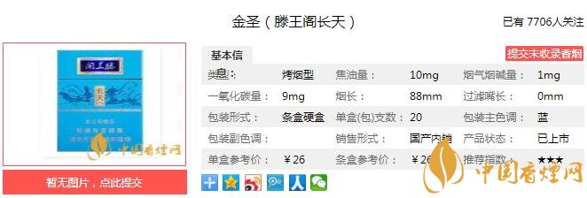 金圣(滕王閣長(zhǎng)天)命名來(lái)源于《滕王閣序》:“落霞與孤鶩齊飛,秋水共長(zhǎng)天一色”。目前我所知道的滕王閣系列,大概有10種。其中,粗支規(guī)格(煙支長(zhǎng)度84mm及以下)7種、細(xì)支規(guī)格2種,中支規(guī)格1種。文中的長(zhǎng)天,就屬于中支規(guī)格。下面就由香煙網(wǎng)小編帶大家一起來(lái)了解金圣(滕王閣長(zhǎng)天)的相關(guān)信息。