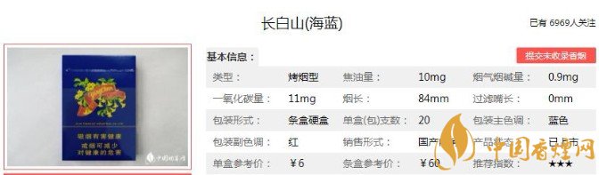 長白山(海藍(lán))的性價(jià)比較高,海藍(lán)色的濾嘴顯得十分好看,抽起來的時(shí)候煙氣正好。現(xiàn)在產(chǎn)品復(fù)出雖然無法全部找到當(dāng)年的產(chǎn)品回憶,但是焦油量還是非常值得肯定的。下面便是長白山(海藍(lán))的基本參數(shù):焦油量:10mg 煙堿量:0.9mg 一氧化碳量:11mg.
