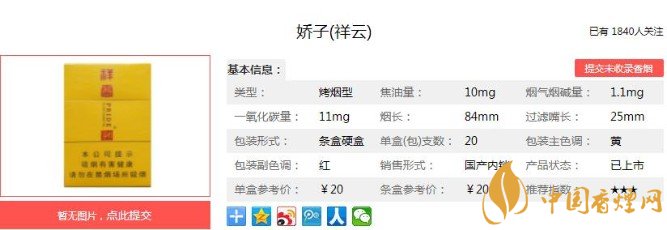 以上便是香煙網(wǎng)小編為大家介紹的關(guān)于祥云嬌子多少錢一包,祥云嬌子價(jià)格20元一包的相關(guān)信息,看完之后大家是不是對(duì)于嬌子(祥云)這款香煙的相關(guān)信息更加了解呢。大家還想查詢更多的相關(guān)內(nèi)容歡迎點(diǎn)擊:嬌子寬窄平安價(jià)格30元一包,傳承寬窄系列的口感!