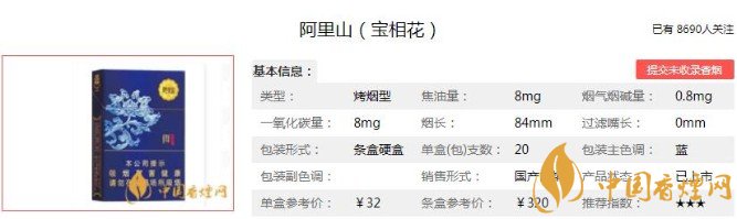 寶相花采用高效降焦卷煙紙,以及多種減害降焦材料與技術(shù),使得香煙焦油量完美的控制在8mg。煙支的金圈設(shè)計(jì),非常的好看,還有降焦線的設(shè)計(jì),也是屬于比較美觀的那一種,細(xì)節(jié)方面是非常到位的。下面便是阿里山(寶相花)的基本參數(shù):焦油量:8mg 煙堿量:0.8mg 一氧化碳量:8mg.