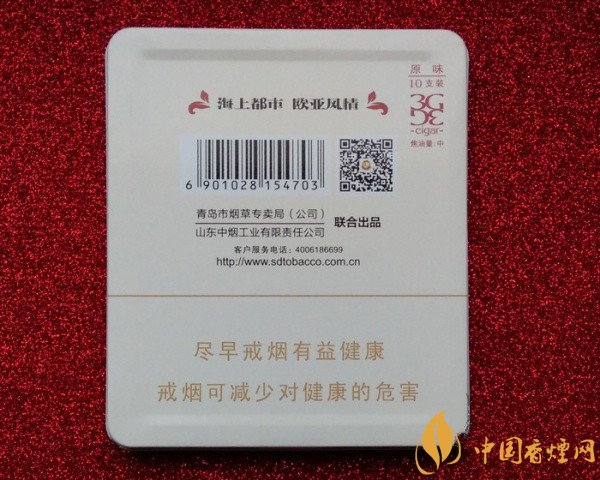 泰山(3G原味)采用3D鐵盒裝置,以青島五四廣場的建筑性標(biāo)志為主圖背景,突出青島這座海山都市獨(dú)有的文化底蘊(yùn)。它的焦含量中等,煙香馥郁芬芳中夾帶著些許的甜潤感,吸味醇正細(xì)膩,簡約而時(shí)尚個(gè)性的外觀,深受時(shí)尚界煙客的喜愛。為了對這款泰山雪茄型香煙價(jià)格有一個(gè)詳細(xì)的了解,先來看看這款泰山雪茄多少錢一盒?據(jù)小編調(diào)查得知市場售價(jià)為25元/包。
