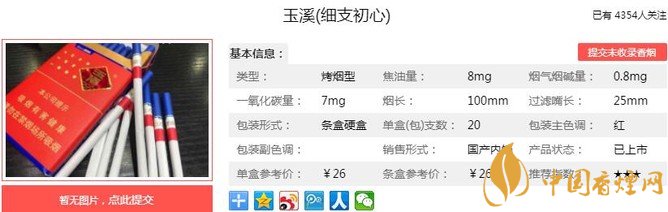 玉溪細(xì)支初心煙支長100mm,過濾嘴長:25mm,應(yīng)用自主特色加香技術(shù),彰顯涼茶生津回甜與煙香醇和飽滿的有機(jī)融合,強(qiáng)化清新、自然、優(yōu)雅的復(fù)合清香型風(fēng)格。下面我們一起來看玉溪細(xì)支初心的參數(shù)信息:焦油量:8mg 煙堿量:0.8mg 一氧化碳量:7mg