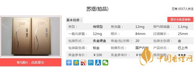 以上便是由香煙網(wǎng)小編為大家介紹的關(guān)于蘇煙鉑晶好抽嗎 蘇煙鉑晶價(jià)格及參數(shù)介紹的相關(guān)信息,想要了解更多有關(guān)內(nèi)容請(qǐng)點(diǎn)擊:蘇煙軟金砂C多少錢一包 蘇煙軟金砂C口感及參數(shù)介紹