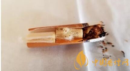 剖開濾嘴,為兩段式濾嘴。濾嘴絲束的總長恰好到水松紙那圈回字紋之處。降焦孔開在了兩段濾嘴絲束的交界處。前段絲束間雜有細小的棕黃色顆粒。這是云煙新的濾嘴技術(shù),顆粒物為云南地產(chǎn)古樹普洱茶萃取物。