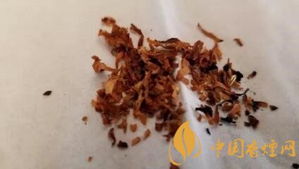 煙絲從外觀上檢視,由棕黃和明黃煙絲組成,品級不錯。煙絲切寬1mm左右。間雜切成細小圓片裝的煙梗。用料還是比較考究的。