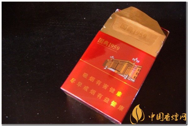 人民大會(huì)堂國(guó)典1959外包裝色調(diào)呈現(xiàn)為雙色系,一面為鮮紅色,另一面為金黃色。在正面的開(kāi)盒的部位上有著金色的 “人民大會(huì)堂”字樣。煙盒的中間部分略上是“國(guó)典1959”,接著是人民大會(huì)堂圖案。煙盒的下部分是警示語(yǔ)言,“吸煙有害健康,盡早戒煙有益健康”。 該款香煙的煙盒背面是金黃色調(diào),上部分是也就是煙盒的左上角是“國(guó)典1959”,煙盒的正中是天安門禮燈圖案。