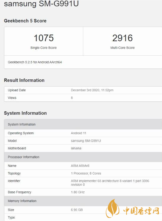 搭載 高通驍龍888 處理器的三星S21,單核跑分為1075分,多核跑分為2916分。 ???