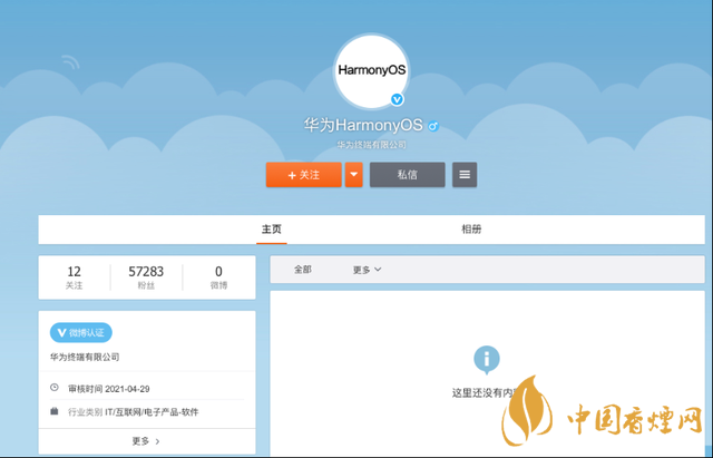 微博頁面顯示,“華為HarmonyOS”微博認(rèn)證為華為終端有限公司,審核時(shí)間為4月29日。雖然目前該官方微博還未發(fā)布任何動(dòng)態(tài),但粉絲量已經(jīng)接近6萬。