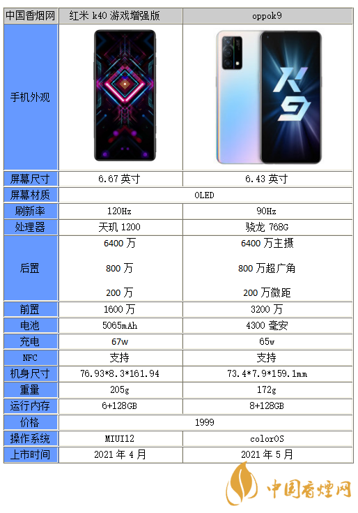 以上就是小編收集到的oppok9和紅米k40游戲增強(qiáng)版買哪個(gè)-參數(shù)性能對比的相關(guān)內(nèi)容,以上內(nèi)容均來源于網(wǎng)絡(luò),僅供參考,一切以實(shí)際為準(zhǔn),更多最新數(shù)碼資訊請關(guān)注香煙網(wǎng)。