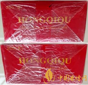 真品卷煙條盒正面“紅旗渠”字體筆畫“起凸”字體高出商標(biāo)紙平面,有立體感,筆畫蒼勁有力,視覺(jué)沖擊力強(qiáng)。條盒背面“HONGQIQU”字母與正面印刷相同。