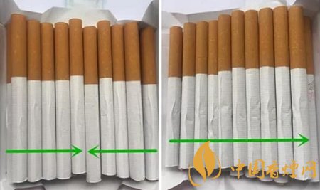 同一包卷煙內(nèi),真品卷煙煙支卷接紙有兩個(gè)相反的搭口方向;而假煙的煙支卷接紙搭口方向均為同一個(gè)朝向。