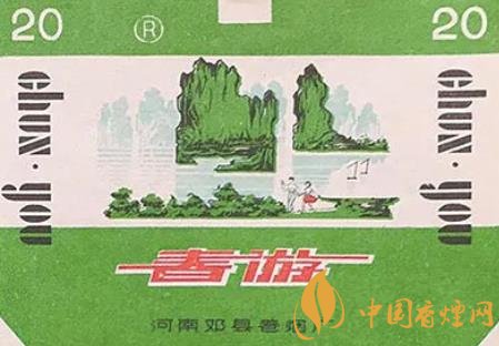 上世紀(jì)80年代,河南鄧縣卷煙廠出品的“春游”煙標(biāo),主版展現(xiàn)了山巒疊翠、水波蕩漾、帆影點點的迷人風(fēng)光,在這美景中,兩個人手牽著手走在綠草如茵的岸邊,其中一個女孩身穿紅裙,為滿目的綠增添了一抹亮色,另一個人伸手指著前方,似乎正在指引伙伴欣賞這美麗的湖光山色。