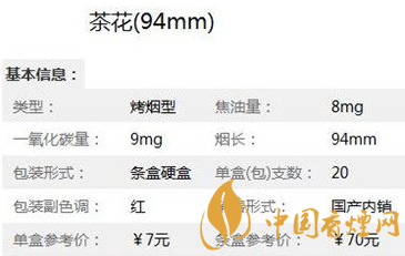 在了解了細支白盒茶花煙多少錢一包 之后,為了大家能更詳見的了解此煙,小編特意將茶花(94mm)香煙的核心參數(shù)進行了整理,以便于對它進行更深入的了解。
