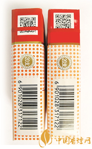 真煙商標(biāo)紙色澤鮮艷,二維碼位置較低,“20支”字樣位置稍高。假煙商標(biāo)紙色澤淺淡,二位碼位置較高,“20支”字樣位置稍低。