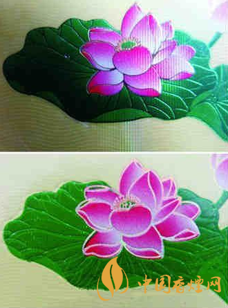 4.看小盒正面荷花logo圖案,真品鉆石荷花,該處是采用凹凸?fàn)C金技術(shù)印刷,“荷花”圖樣立體感明顯,尤其是花蕊位置清晰;而假煙是采用高清照相掃描進(jìn)行仿制,logo圖案套色、燙金不準(zhǔn)確,花蕊位置模糊。