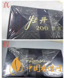正面商標(biāo)紙差異對比:真品卷煙采用絨面印刷工藝,花形悉心勾勒,更顯質(zhì)感,圖案“牡丹花”更為寫實。假冒偽劣“牡丹(軟藍)”多以舊版“牡丹花”造型進行模仿,其圖案與真品存在明顯差異。