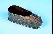這款造型奇特的工藝煙灰缸來自以色列,為金屬質(zhì)地,外層漆金。整體造型為以色列特有的翹頭鞋,鞋跟處伸出一截短短的煙槽,鞋口則有陰刻的“JERUSALEM”(耶路撒冷)字樣;鞋身用簡單的黑、紅、黃、白勾勒了具有明顯地域色彩的花紋,如回首的駱駝、椰樹、城墻等。整件作品的造型和色彩都帶有濃郁的中東風(fēng)情,高檔煙灰缸圖片十分別致。